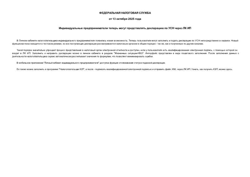 Статус: Информационный документ Текст документа: присутствует в коммерческой версии NormaCS Утвержден: ФНС России; Федеральная налоговая служба, 13.10.2025 Обозначение: Информация Наименование: Индивидуальные предприниматели теперь могут представлять декларацию по УСН через ЛК ИП Дополнительные сведения: доступны через сетевой клиент NormaCS. После установки нажмите на иконку рядом с названием документа для его открытия в NormaCS